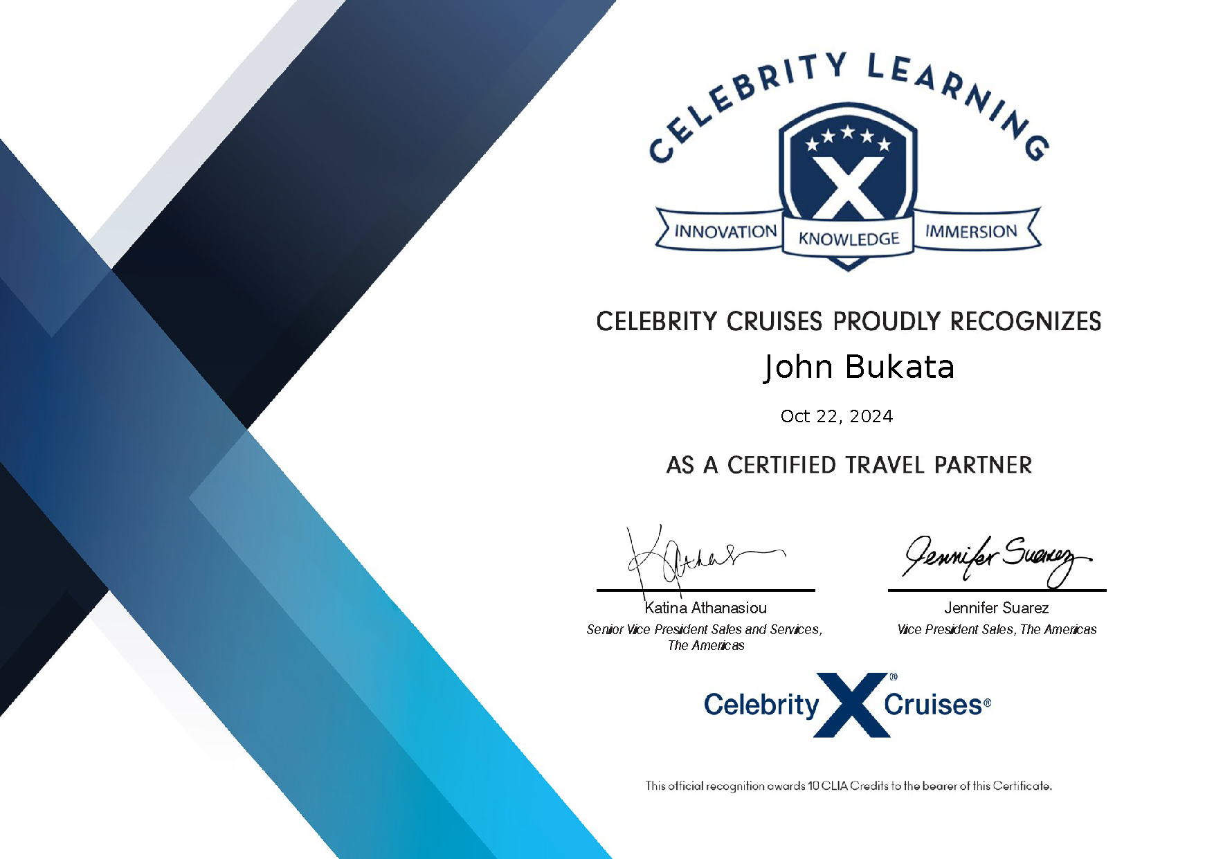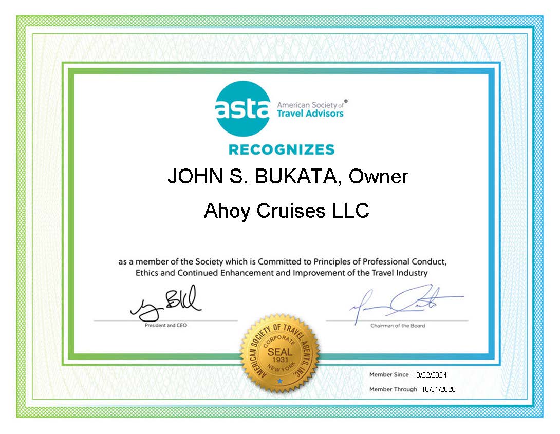 John is a proud member of the American Society of Travel Advisors (ASTA) and Cruise Lines International Association (CLIA). He is also a CLIA Accredited Cruise Counselor and a CLIA Certified River Cruise Specialist, bringing expert knowledge, trusted partnerships, and personalized service to every booking.